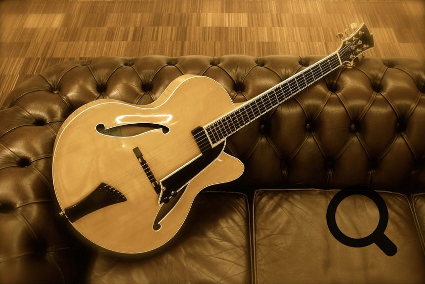 -floating Benedetto pickup with volume and tone control mounted on pickguard
